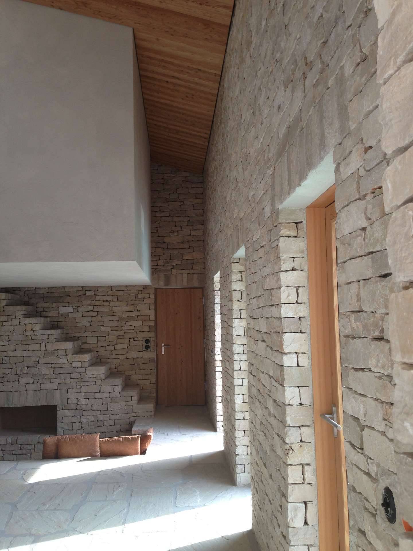 Demolizione e successiva ricostruzione di fabbricato preesistente con l'impiego di struttura portante in ferro, totalmente antisismica. Rivestimento in muri di pietra a speciale lavorazione a secco, senza fughe in malta. Completa l'opera la realizzazione di una nuova piscina ad uso esclusivo con bordo a sfioro e a cascata.